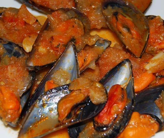 Separe as conchas, retirando aquelas que não contém o mexilhão e reserve a outra parte que tem a carne presa do mexilhão. Depois, é a vez de preparar o molho à marinheira. Primeiro, pique a cebola, os dentes de alho e corte o tomate em pedaços. Em uma caçarola com um pouco de azeite de oliva, coloque a cebola e o alho picado. Quando dourarem, acrescente também o tomate picado e cozinhe em fogo lento durante 3 minutos mais.