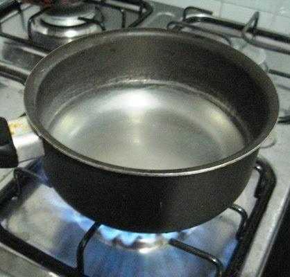 Leve ao fogo um tacho com as 2 xícaras de água, 1 colher de sopa de manteiga, a casca do limão e um pouco de sal.