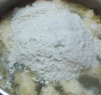 Quando o preparado anterior começar a ferver, desligue o fogo e adicione a farinha, mexendo bem para envolver e até que esta comece a descolar do tacho. Reserve.