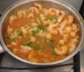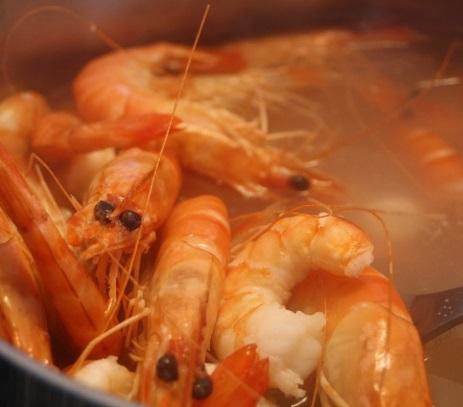 Num tacho à parte, coza os camarões em água. Se tiver optado por usar camarões inteiros, depois de cozidos reserve e água da cozedura e retire-lhes a cabeça e a casca.