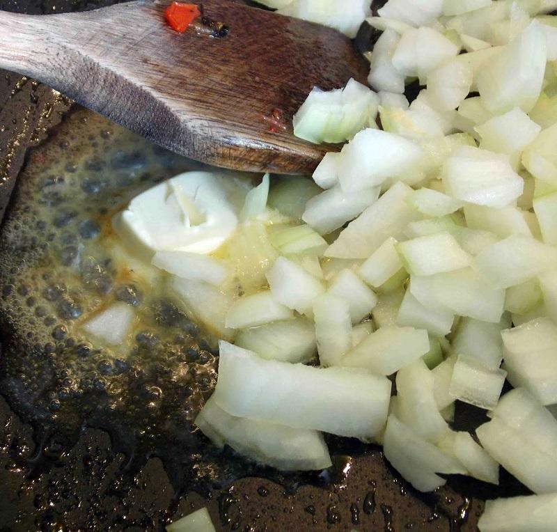 Leve a refogar a cebola com as duas colheres de sopa de manteiga. Quando estiver dourada, adicione os camarões e polvilhe farinha sobre eles.