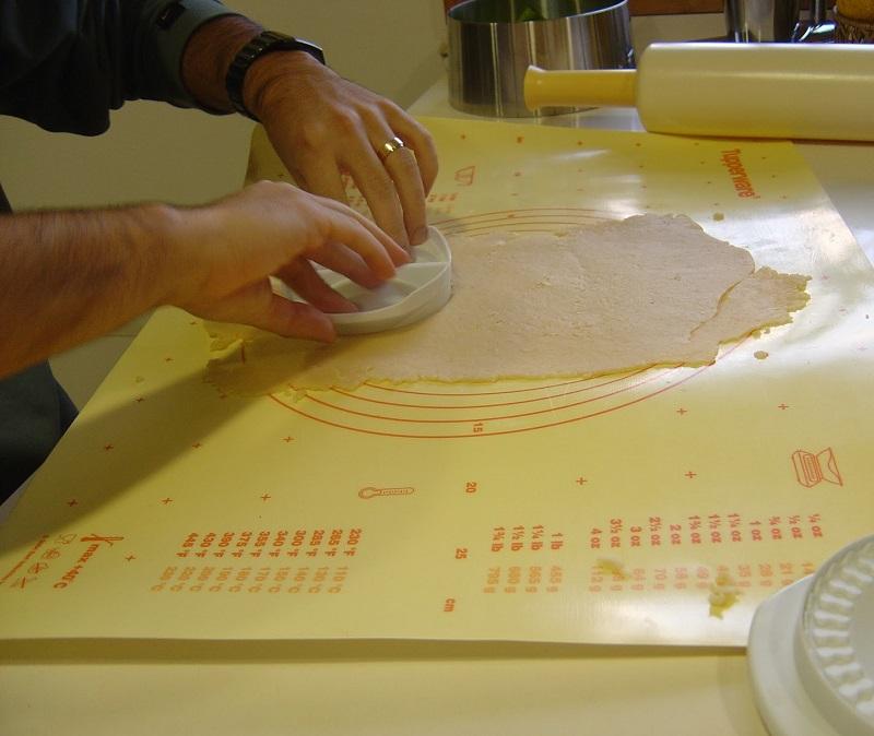 Agora pegue na massa dos rissóis e estenda-a sobre a bancada, com a ajuda de um rolo. Corte pequenos círculos e coloque no meio um pouco do recheio preparado anteriormente.