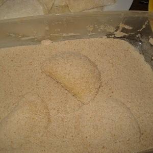 Faça uma dobra a meio na massa com o recheio e feche esse rissol. Passe-o pelas gemas do ovo e, em seguida, por farinha de rosca.