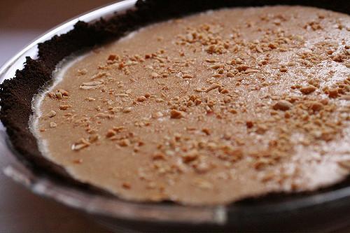 Comece misturando o chocolate em pó, a farinha de amêndoas e o açúcar. De seguida derreta a manteiga e junte à mistura. Pegue nesta mistura e coloque no refrigerador pelo menos uma hora. Enquanto isso, comece a fazer o recheio da sua torta. Ao creme de leite junte gradualmente a menta, que deve ser cortada em pedaços muito finos. Coloque em fogo baixo e deixe ferver. Depois disso, desligue o lume, tampe a panela e deixe repousar uma meia hora. Não se esqueça de coar a mistura, para que não fique nenhuma folha perdida.