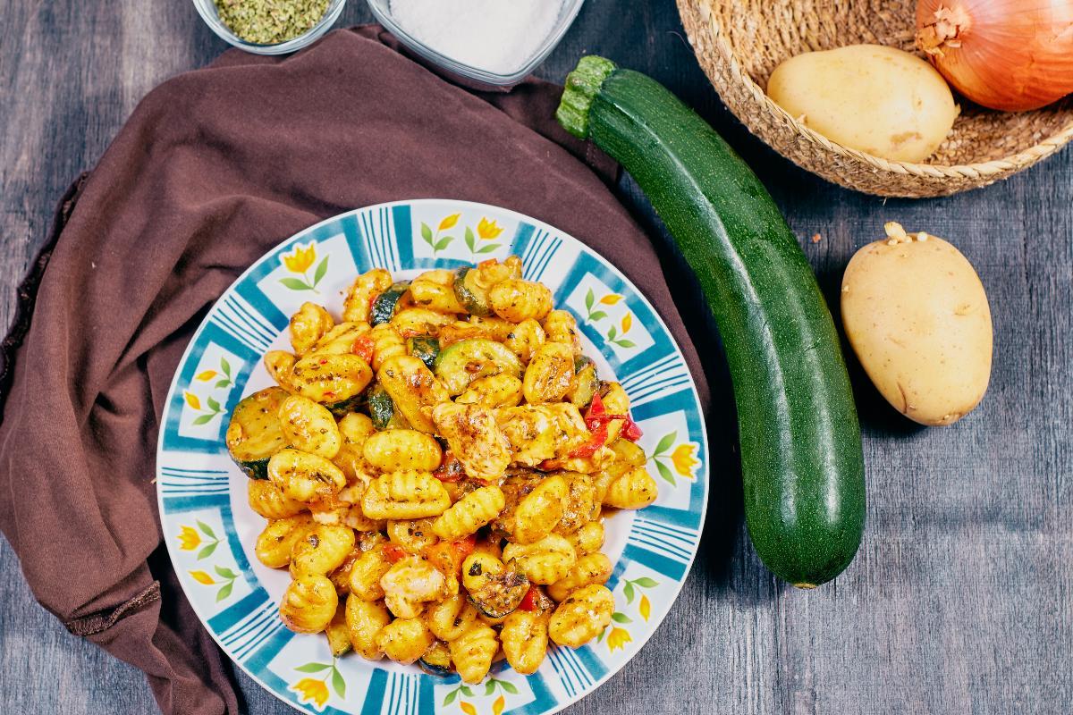 Pimentões, berinjelas, abobrinhas e cebolas, quando assados, combinam perfeitamente com nhoques. O resultado é um prato colorido, saboroso, saudável e reconfortante.