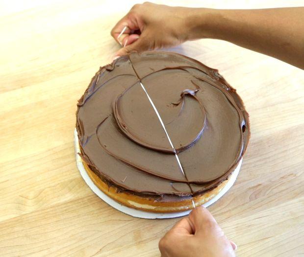 Um truque bastante utilizado para partir bolo em duas partes ou mais é com um fio de náilon, sendo que o fio dental também pode ser usado, porém, é melhor um que não tenha sabor. Caso o corte seja no meio para dividir o bolo em duas partes, é preciso deixá-lo em uma superfície plana e identificar onde será o corte.