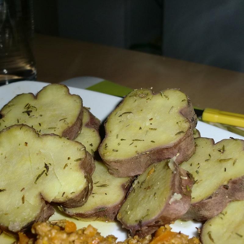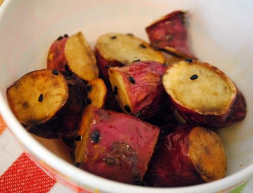 Pingue as batatas com um pouco de azeite e tempere a gosto (pode usar manteiga e açúcar, ou pimenta do reino, alecrim e alho). Leve ao forno e deixe assar durante 30 minutos, até que fiquem douradas.