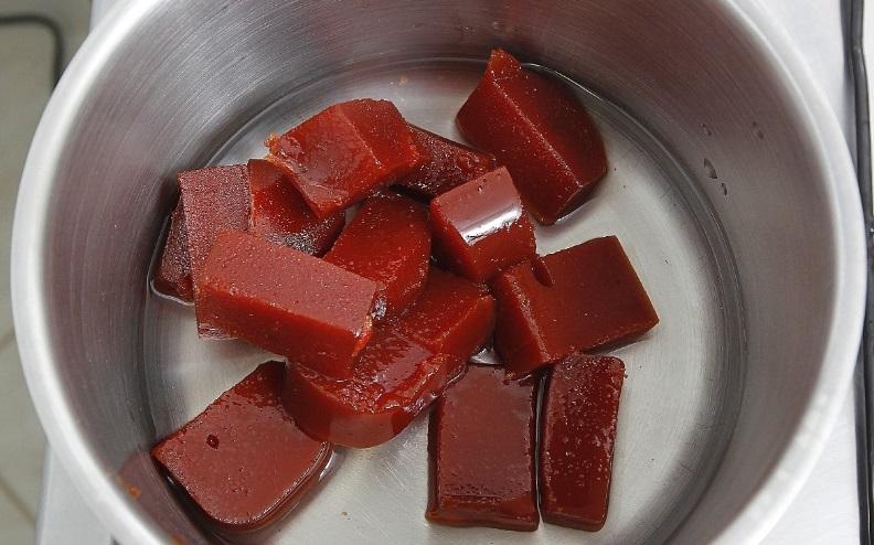 - Coloque os pedaços de goiabada em uma panela e adicione meia quantidade de água, ou seja, se você colocar uma xícara de goiabada picada, por exemplo, deve adicionar 1/2 xícara de água;