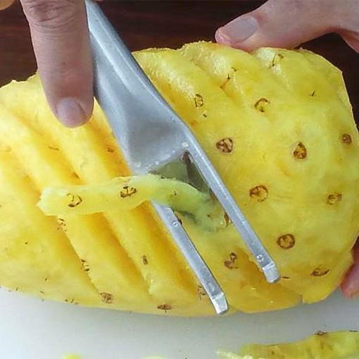 Seu abacaxi já está descascado! Se restaram alguns pontos negros na fruta, você pode eliminá-los com um descascador de batatas ou fazendo cortes em forma de V em cada ponto a eliminar.