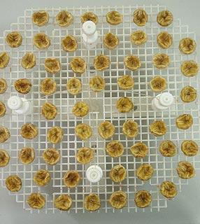 Coloque as fatias finas de banana lado a lado, numa grelha que possa ir ao forno, é aconselhado usar uma grelha, assim ambos os lados ficam expostos ao ar, que torna a secagem mais rápida. Coloque uma bandejinha por baixo da grelha para não sujar o forno com a água que vai acabar pingando. Se não tiver uma grelha de forno coloque numa travessa forrada a papel manteiga e deixe a porta do forno ligeiramente aberta para ajudar a umidade a sair. O processo com a travessa é mais demorado do que com a grelha.