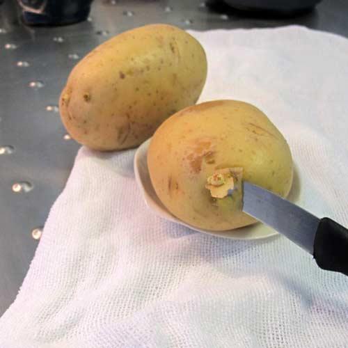Coloque as batatas lavadas sobre um pano e seque-as, quando estiverem secas, use uma tábua e uma faca bem afiada para cortar as batatas em rodelas bem finas.