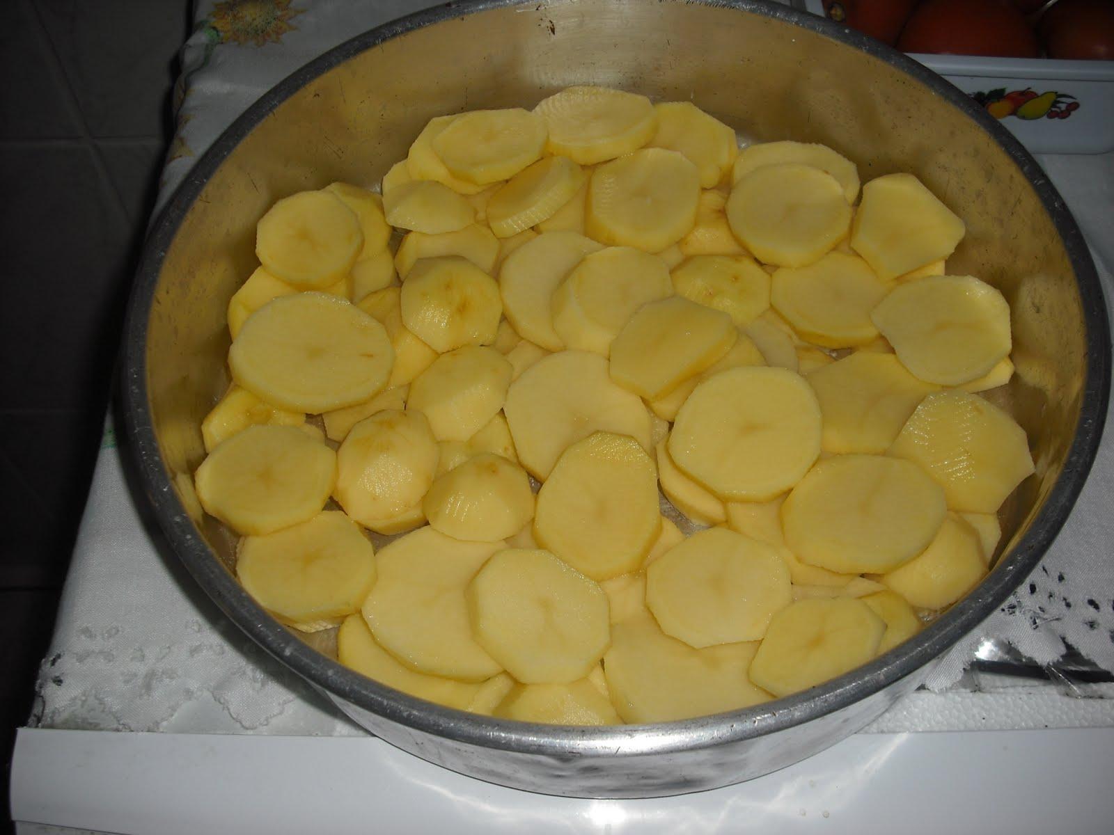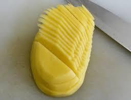 Depois das batatas estarem às rodelas, pegue em 2 rodelas, ou mais se conseguir, coloque-as em cima umas das das outras e corte na vertical, faça fatias finas para parecer mesmo com batata palha.