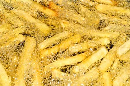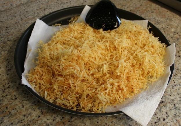 Coloque as batatas numa frigideira com óleo bem quente, deixe-as alourar um pouco, de ambos os lados, como são muito fininhas, fritam bem rápido, esteja com atenção.