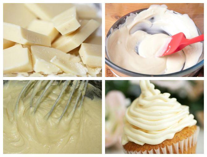 A receita de cupcake simples é perfeita para usar com qualquer ganache, mas neste caso, por questões óbvios, sugerimos a cobertura de ganache de chocolate branco: