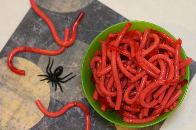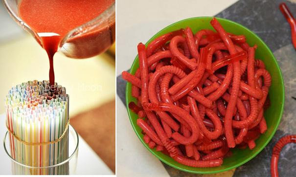 Já pensou em fazer minhocas de gelatina e surpreender todos os seus convidados neste Halloween? É muito simples! Coloque canudinhos em um recipiente alto, puxe os canudos de forma a abrir aquela parte flexível e prenda-os com um elástico. Em uma tigela com 3 xícaras de água fervente misture 2 embalagens de gelatina de sabor a morango e uma sem sabor. Assim que a mistura ficar morna, adicione 3/4 xícara de creme de leite, para que a cor da minhoca fique opaca. Depois adicione lentamente a mistura da gelatina nos canudos e leve à geladeira por no mínimo 2 horas. É recomendável que utilize canudos largos.