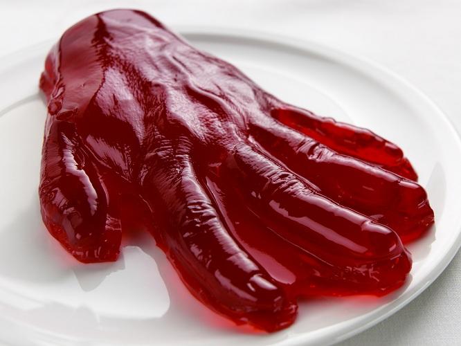 Assuste todos neste Halloween com uma mão cortada de gelatina. Tudo o que você precisa para fazer uma mão cortada de gelatina é de uma luva de plástico transparente limpa, gelatina de morango e uma tesoura. Prepare a gelatina normalmente e deixe esfriar um pouco. Depois verta a mistura para dentro da luva e feche-a dando um nó. Coloque no congelador com cuidado, para não ficar espalmada e conseguir obter um efeito mais realista. Quando a gelatina estiver sólida, corte a luva de borracha e coloque a mão em um recipiente.