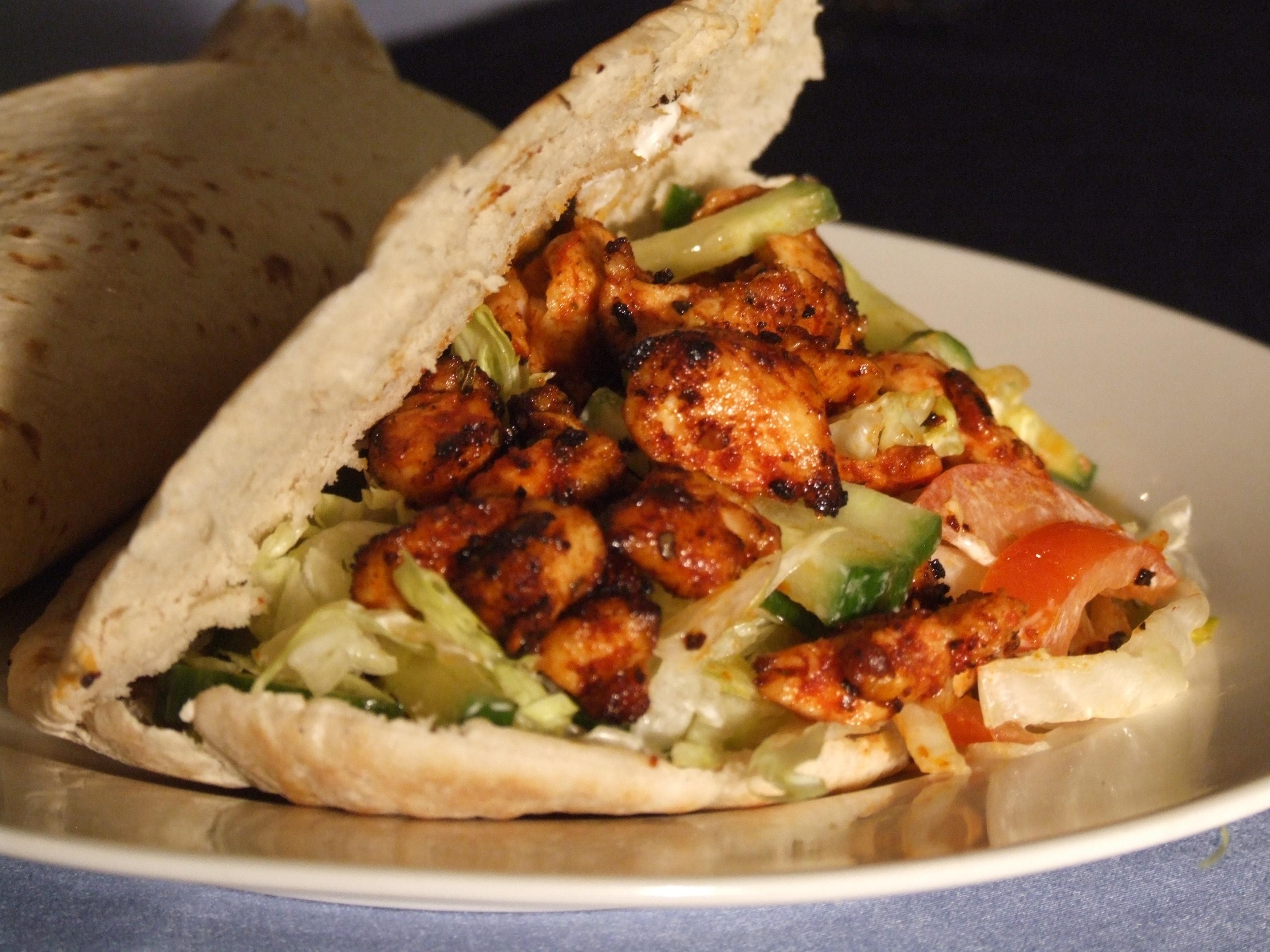 Abra o pão de pita pela metade de forma a montar o kebab. Unte ambas as partes com o molho de iogurte ou maionese e junte a alface e o tomate. Por fim, coloque os filés de frango cortados em tirinhas e pode servir!