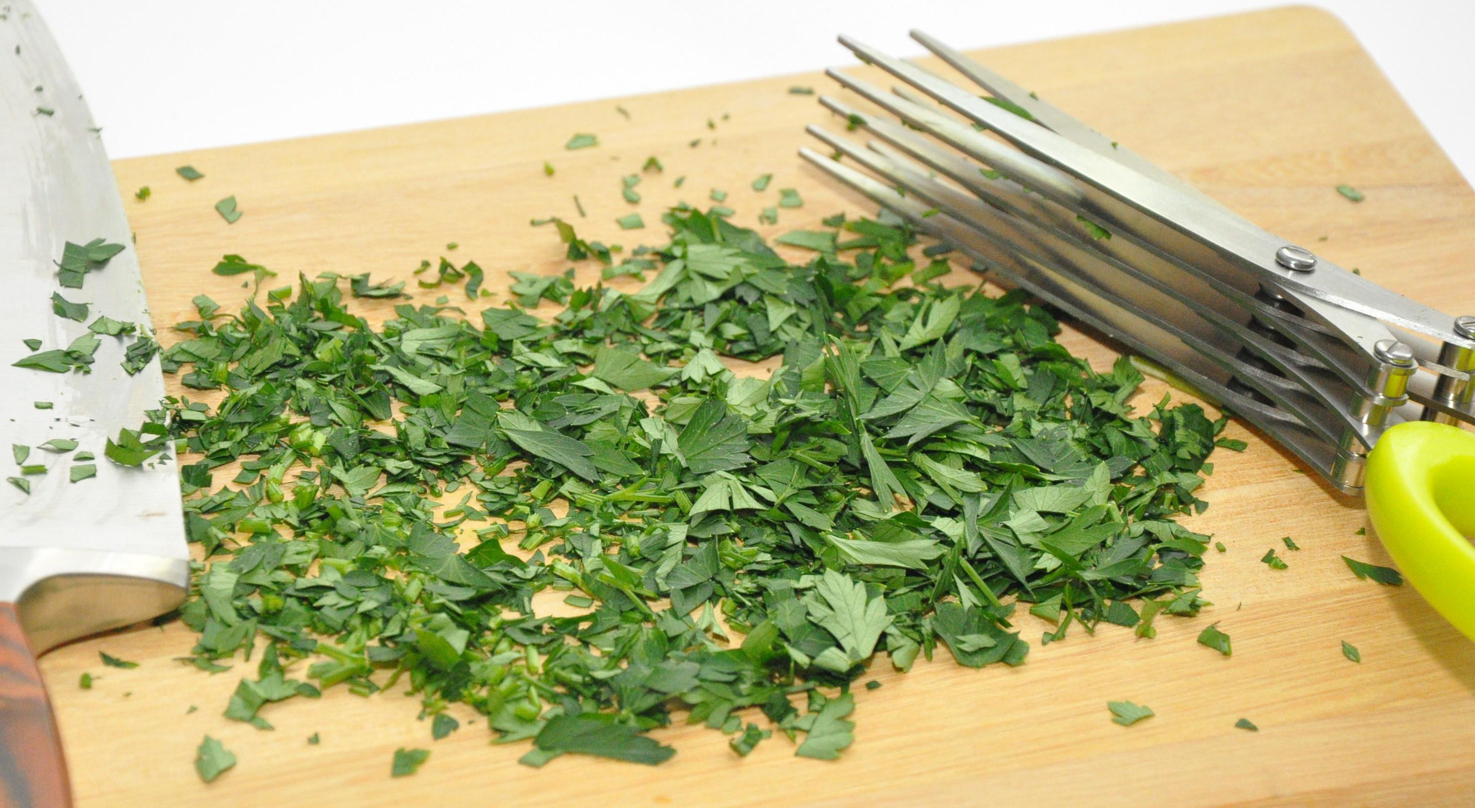 Adicione o que sobrou da salsinha e desligue para que apenas misture a segunda metade, em vez de triturar.