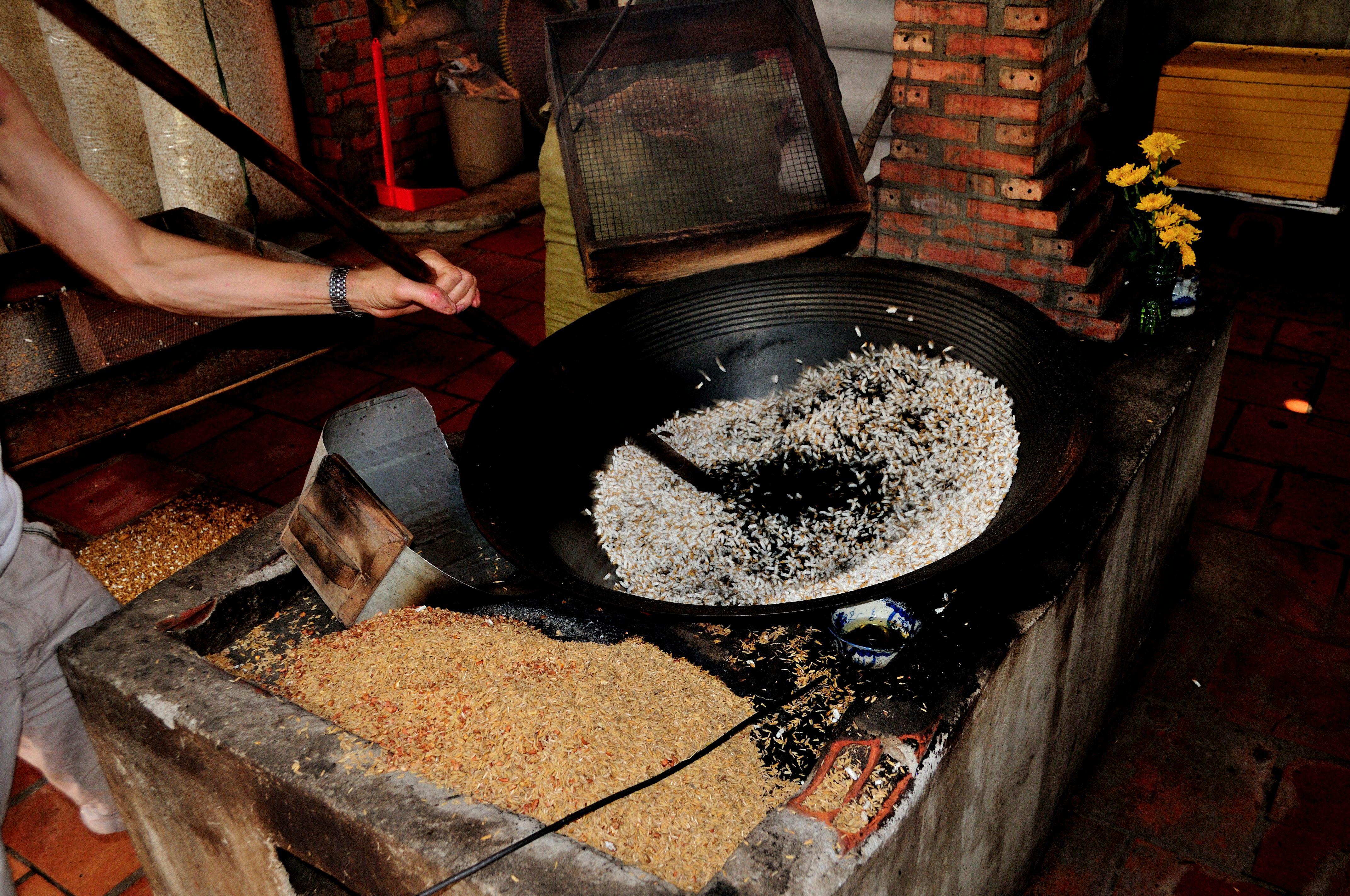 - Despeje os grãos de arroz, lentamente, na wok (com muito cuidado!). Eles devem começar a inchar e estourar.