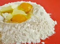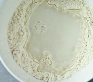 Faça uma montanha na forma de vulcão com os ingredientes e acrescente a água morna e o azeite de oliva.