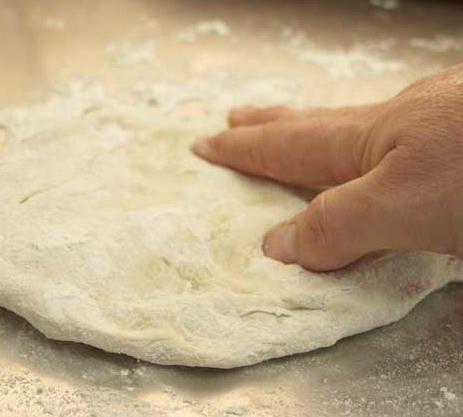 Quando tiver a massa, polvilhe uma superfície lisa com um pouco de farinha ou com sêmola de trigo moída muito fina, e ponha a massa em cima. Trabalhe bem a massa, a ideia é que fique elástica. Pode amassá-la com a base da mão, dobrá-la ao meio e pressionar de novo com a base das duas mãos. Continue repetindo o mesmo processo durante cinco minutos aproximadamente.