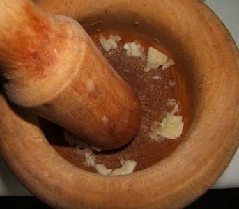 A primeira coisa que deve fazer para fazer o sal de alho é esmagar cinco ou seis dentes de alho grandes no pilão até que não fiquem grumos.