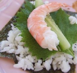 Finalmente, corte as folhas de alga nori no sentido longitudinal. Coloque na mão esquerda uma metade, com a parte lisa para baixo. Coloque na parte superior uma bola de arroz e unte ligeiramente com pasta de wasabi. Cubra com as tiras de legumes, os camarões e a mistura de soja e maionese. Pressione com suavidade e de modo a formar um cone com a folha de alga nori.