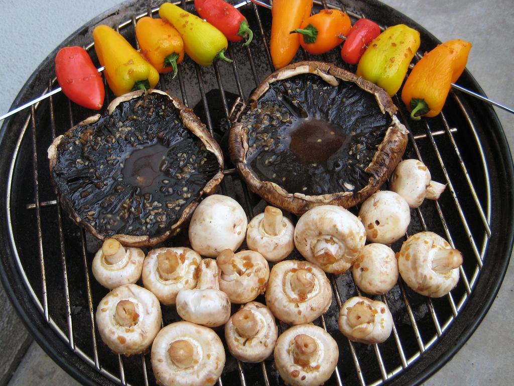 Os cogumelos tornam um churrasco de legumes mais variado e dinâmico. O melhor tipo de cogumelos para churrasqueira é o tipo porcini, que devem marinados em azeite, sal, pimenta-do reino e salsa picada antes de levar à grelha. Demoram apenas alguns minutos a cozinhar e devem ser servidos ainda quentes. Podem ser cortados e servidos em espetos com os legumes.