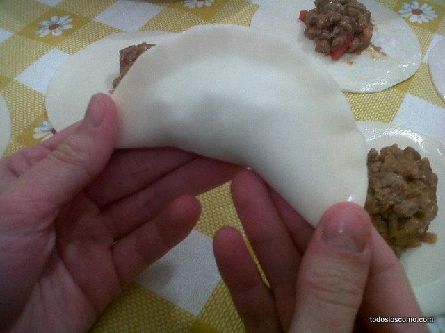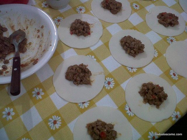 Colocamos uma colher de recheio no centro. É importante que não seja muita quantidade porque se não, a empanada acabará se abrindo. Tem que deixar aproximadamente dois centímetros de massa de margem.