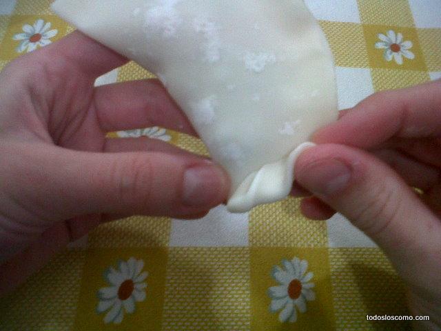 Uma vez fechada a massa, devemos fazer pressão sobre a massa mas não muita para que não que não fique mais fina. Para começar a fazer a borda propriamente dita devemos dobrar uma ponta da massa para dentro com o polegar, como se vê na imagem. Se formos destros, fazemos a borda com a mão direita e vice-versa. Se apoiar a mão sobre a mesa verá como será mais fácil fazer.