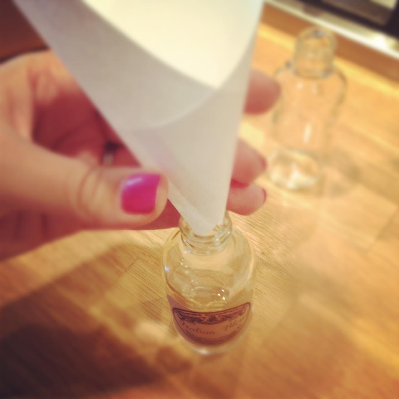 Coloque o funil acabado de fazer dentro da garrafa e segure bem a garrafa e o funil enquanto verte o líquido para que não derrame nem uma gota.