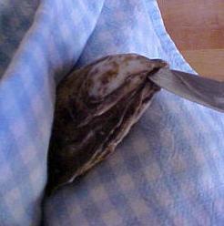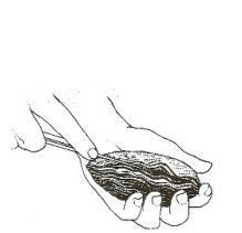 Pegue a ostra com um pano de cozinha, segure-a pela área mais redonda da mesma, deixando livre a área mais pontuda.