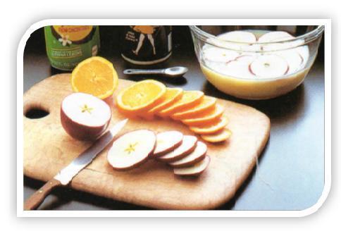 Com um faca afiada, corte a fruta em rodelas de 6 mm sobre uma tábua. Exceto para os cítricos, misture 500 ml de sumo de limão com uma colher de sopa de sal e deixe macerar a fruta nesta solução durante um minuto para não adquirir uma cor marrom.