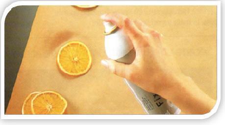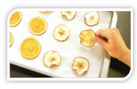 Quando a fruta estiver pronta, tire da bandeja e deixe à parte para que esfrie e fique crocante. Estenda as rodelas já frias sobre um pedaço de papel e borrife por cima um selador acrílico transparente para evitar que absorvam a umidade.