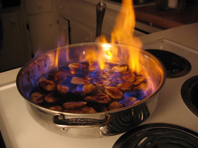 Assim que a chama terminar, pode continuar fazendo o prato normalmente e terminar de cozinhar. Em vez do fósforo se estiver utilizando uma frigideira, pode inclinar um pouco a mesma de maneira a que a chama do fogão acenda o álcool. No entanto deve sempre ter muito cuidado com este procedimento.