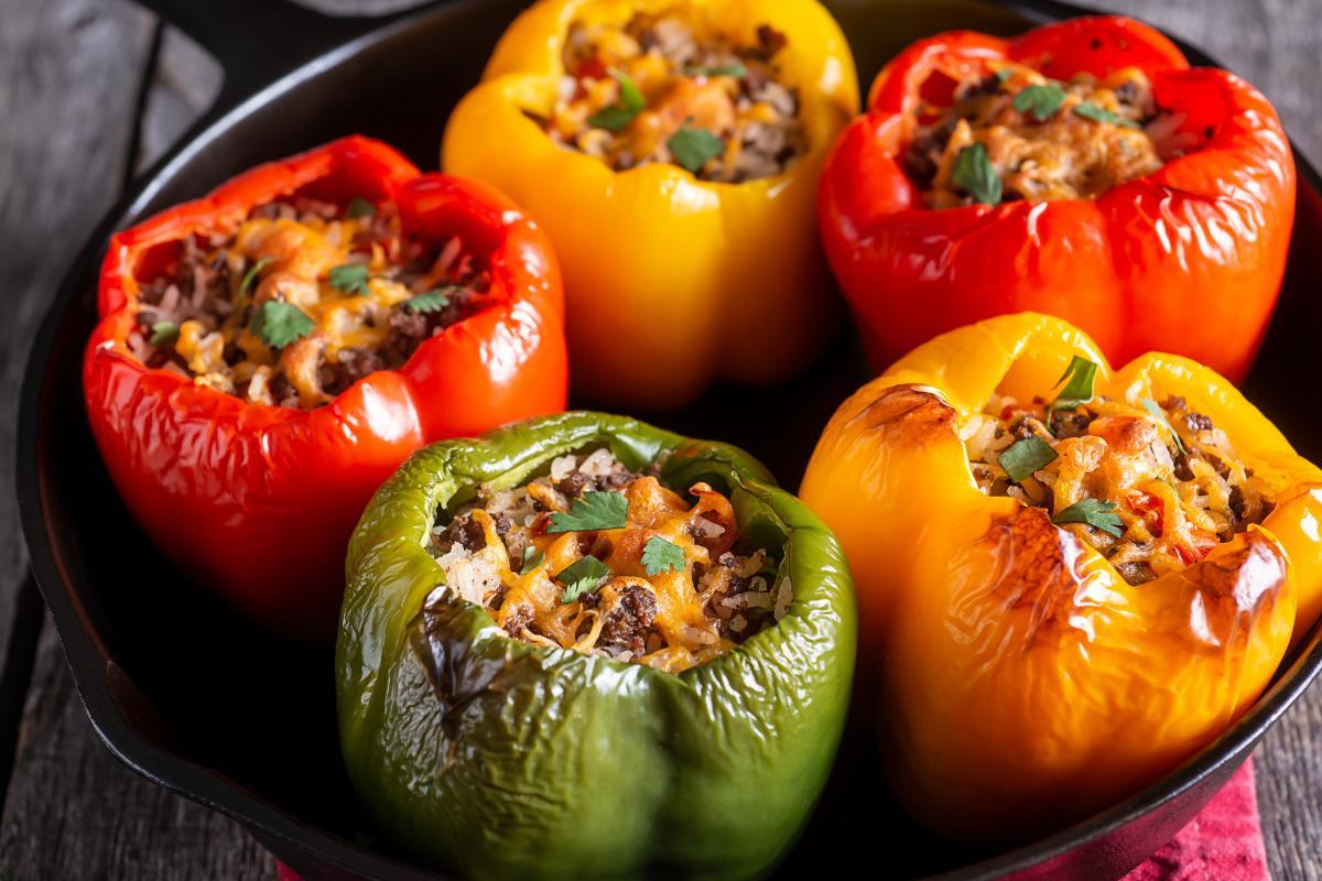 - Recheados: pimentões grandes (vermelhos ou verdes) podem ser recheados com arroz, carne, legumes, queijo ou até atum. Depois, asse-os e ficam deliciosos;