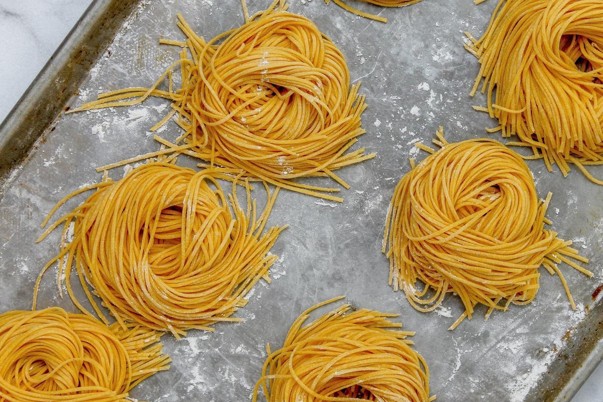 - Faça com que as massas fiquem em uma distância "segura": se você optar por congelar a massa fresca e crua, coloque-a em montinhos, em forma de "ninho", em uma assadeira untada com papel manteiga, sempre deixando uma distância de cerca de uns dois centímetros entre cada montinho. Dessa forma, você vai evitar que elas grudem quando estiverem no freezer, o que dificulta ainda mais na hora de descongelar. Deixe a massa por cerca de uma hora no congelador e, após esse tempo, coloque-a em um recipiente hermético.