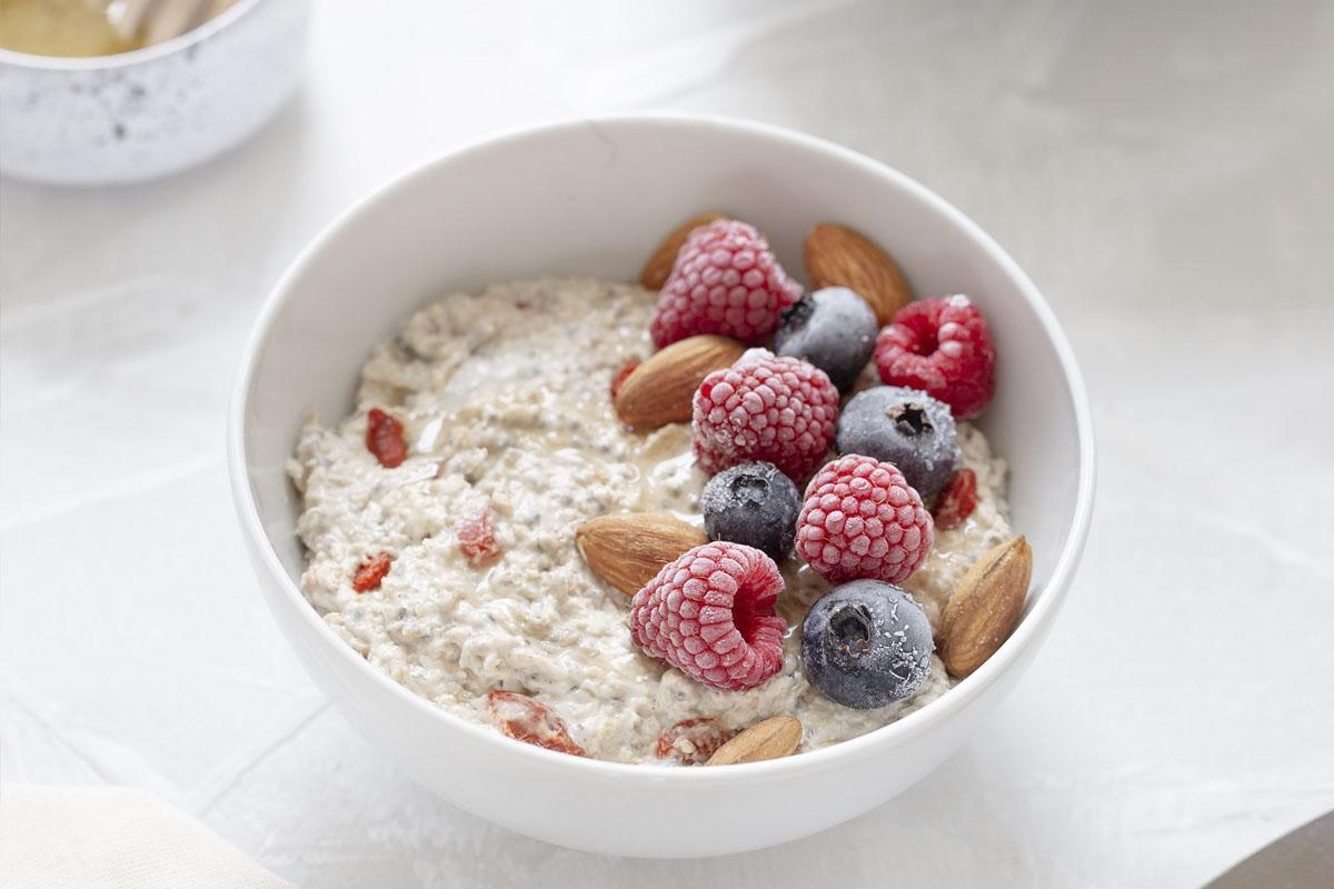 A overnight oats, ou seja, aveia amanhecida, consiste em preparar a aveia na noite anterior ao consumo, misturando 3 ou 4 colheres de sopa de aveia em flocos com iogurte ou outra bebida vegetal de sua preferência. O objetivo é que os flocos fiquem de molho durante toda a noite e, pela manhã, quando estiverem bem suaves e saborosos, você adicione os complementos que preferir: sementes, frutas, frutas secas, etc.