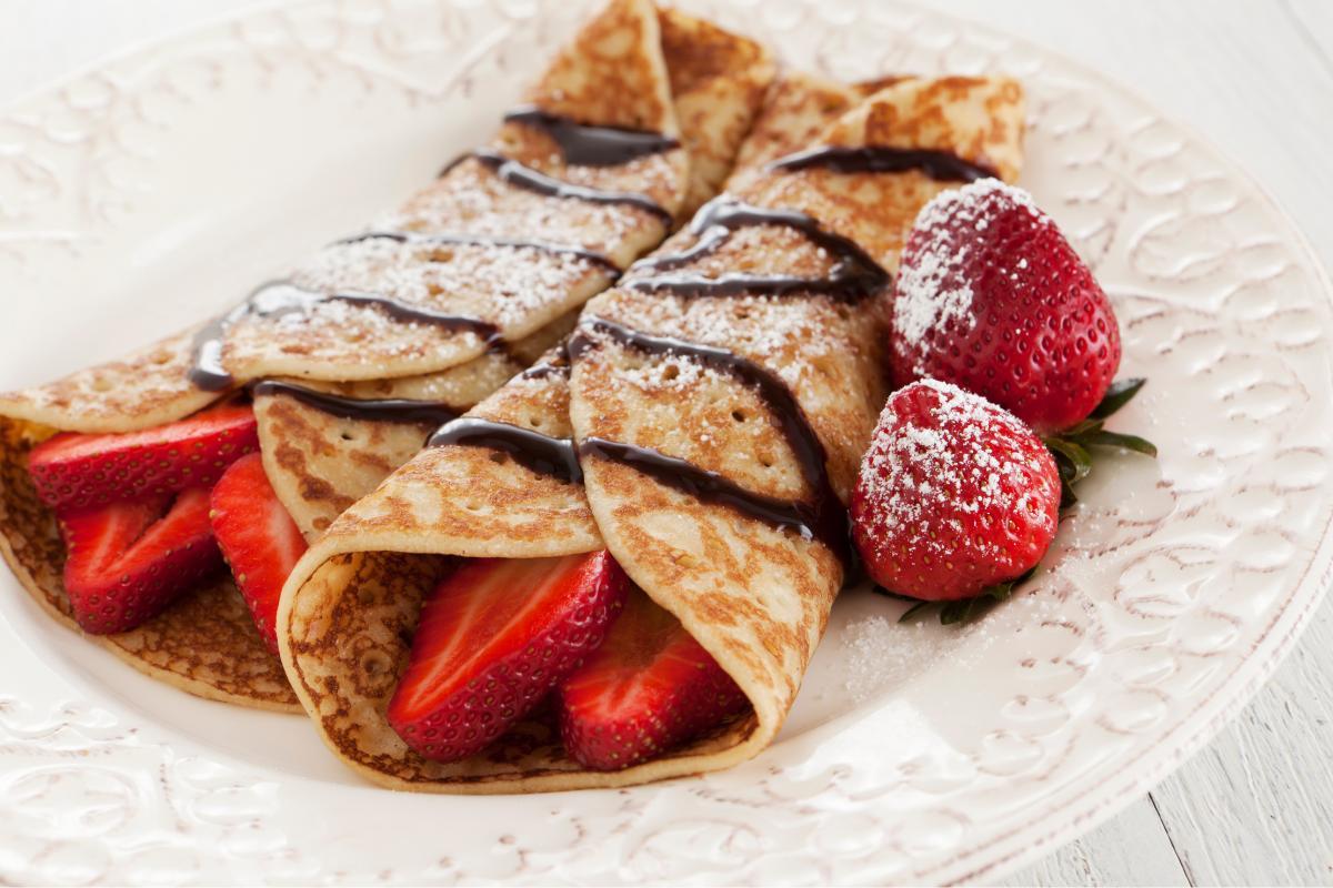 - O recheio e a cobertura desta receita são com chocolate e morangos, em quantidade a gosto, mas você pode experimentar outras combinações que desejar. Aqui te damos mais ideias sobre Como fazer crepes sem glúten.
