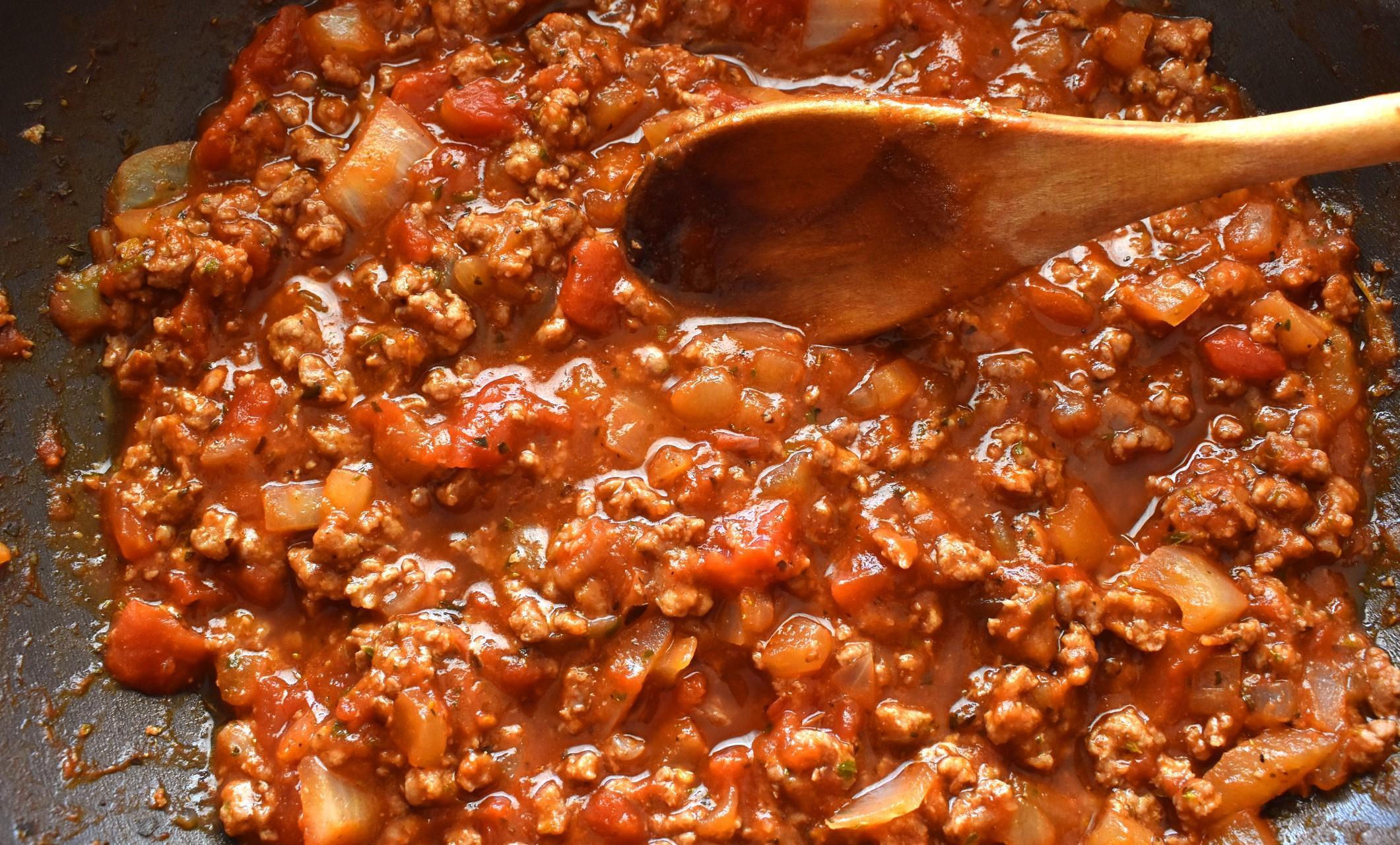 Somente quando os legumes começarem a dourar, acrescente a carne picada e, após alguns minutos, o tomate triturado. O segredo do molho é deixar cozinhar todos os ingredientes em fogo baixo por pelo menos 30 minutos, acrescentando água se necessário e temperando com sal, pimenta e orégano a gosto.