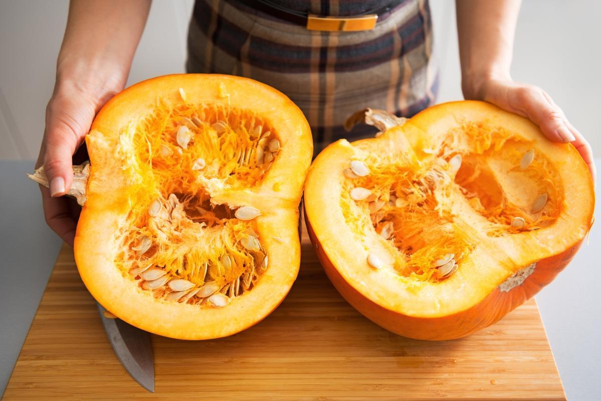 Enquanto o forno estiver aquecendo, lave a abóbora e corte-a ao meio no sentido do comprimento. Recomendamos que você dê uma olhada em nosso artigo sobre Como saber se a abóbora está estragada.