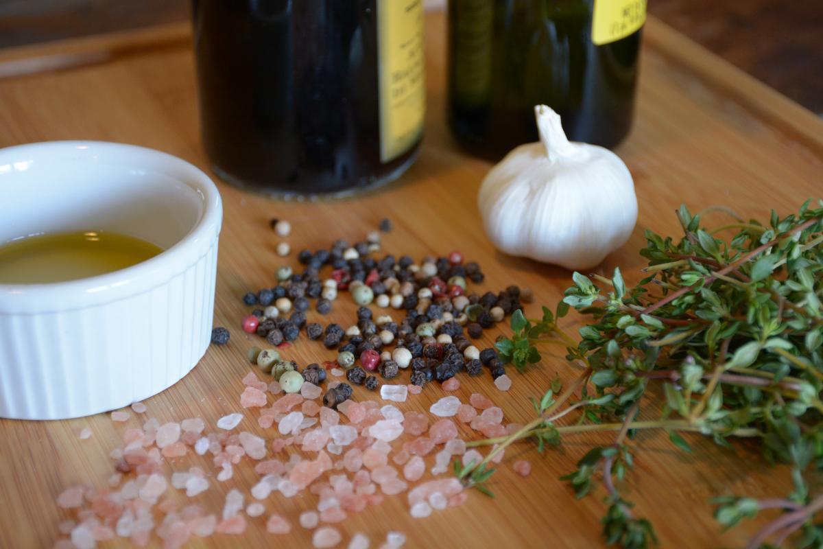 Agora, regue a abóbora com o azeite de oliva e polvilhe com sal, alho em pó, tomilho e pimenta. Todos esses ingredientes são opcionais, mas darão mais sabor ao prato. Você também pode acrescentar outros temperos de sua preferência.