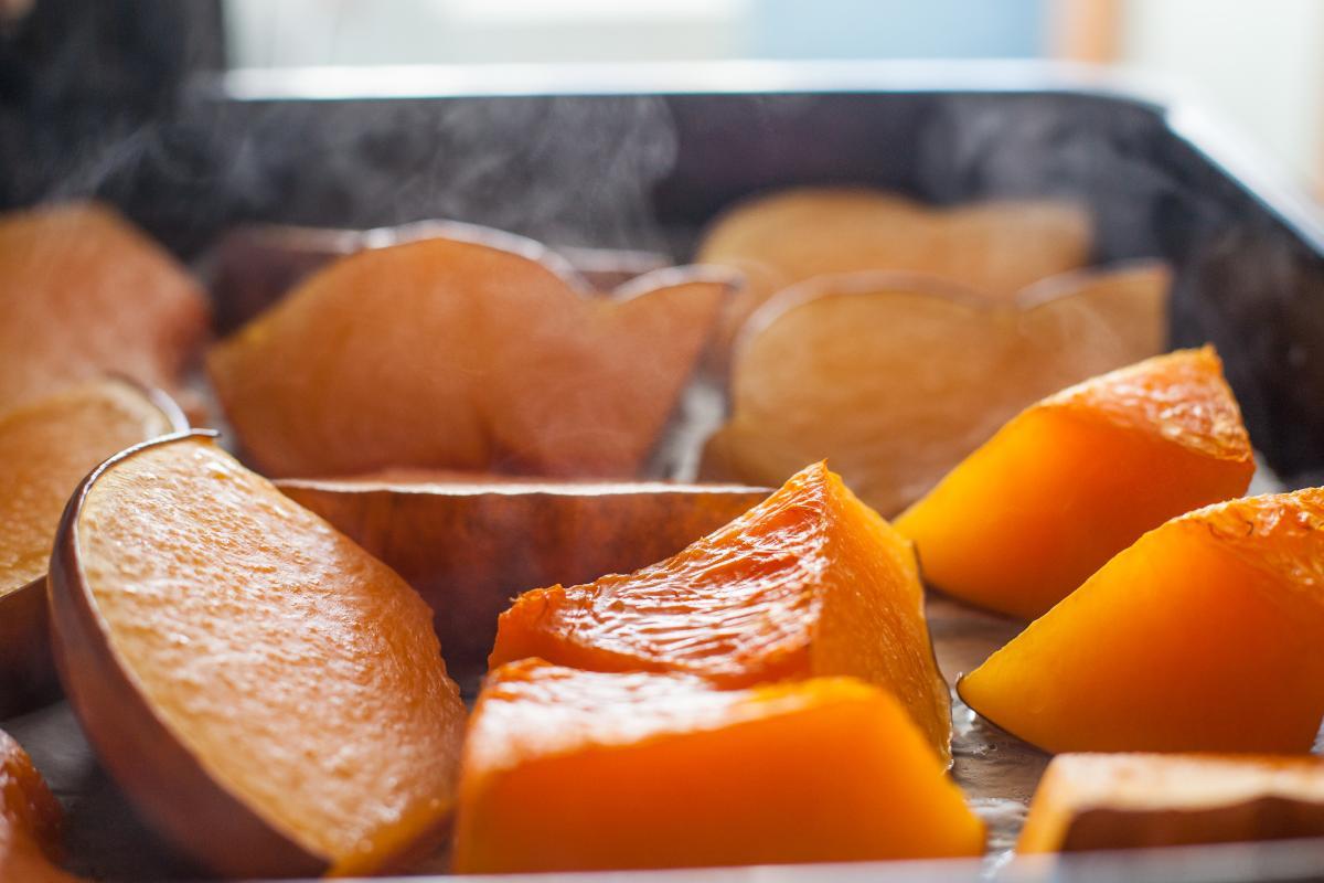 Reduza ligeiramente a temperatura do forno. Asse a abóbora por cerca de 25 a 30 minutos, ou até que esteja macia e você possa remover facilmente a polpa do interior com um garfo.