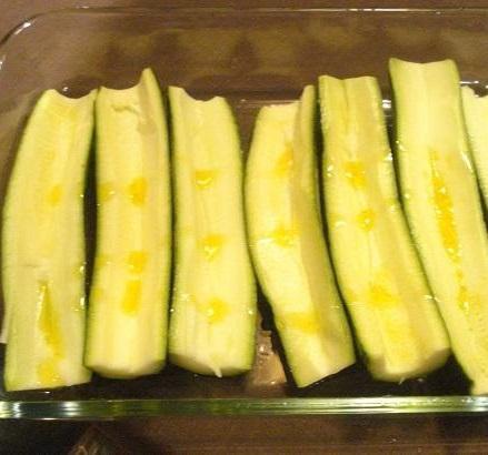 Adicione uma pitada de sal, pimenta e um fio de azeite de oliva às abobrinhas e coloque-as em uma bandeja e leve ao forno. Este deve estar pré-aquecido a 180ºC; asse as abobrinhas durante ao menos 20 minutos.