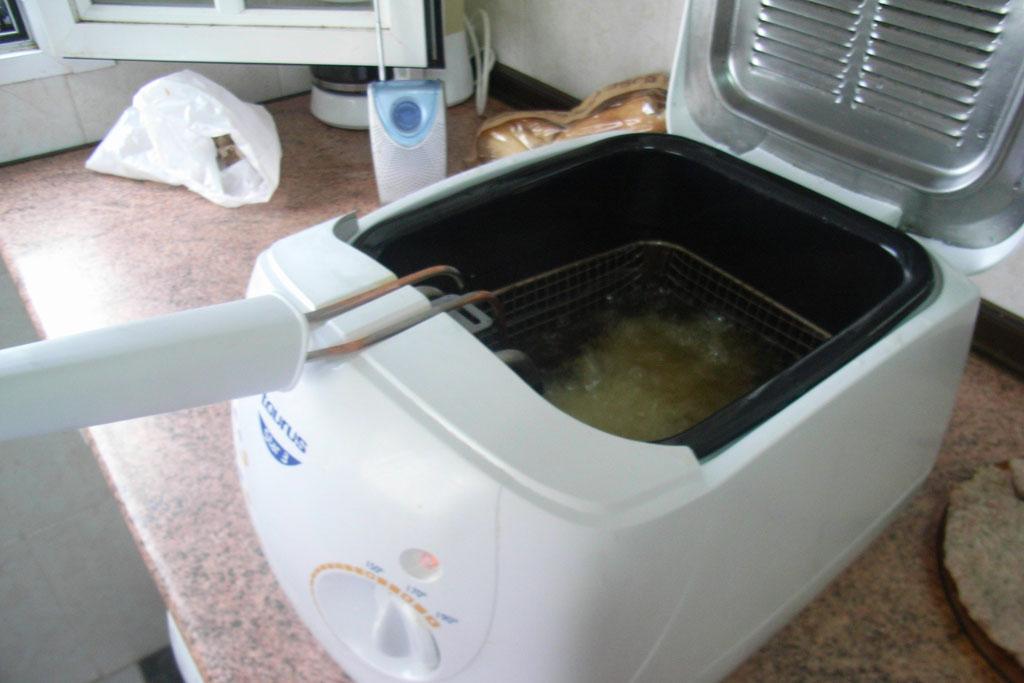 Enquanto isso podemos ligar a fritadeira a 180ºC, ou se preferir usar a frigideira deve colocar o óleo vegetal até atingir um centímetro e meio de altura. Colocando o lume moderado. Deixe aquecer.
