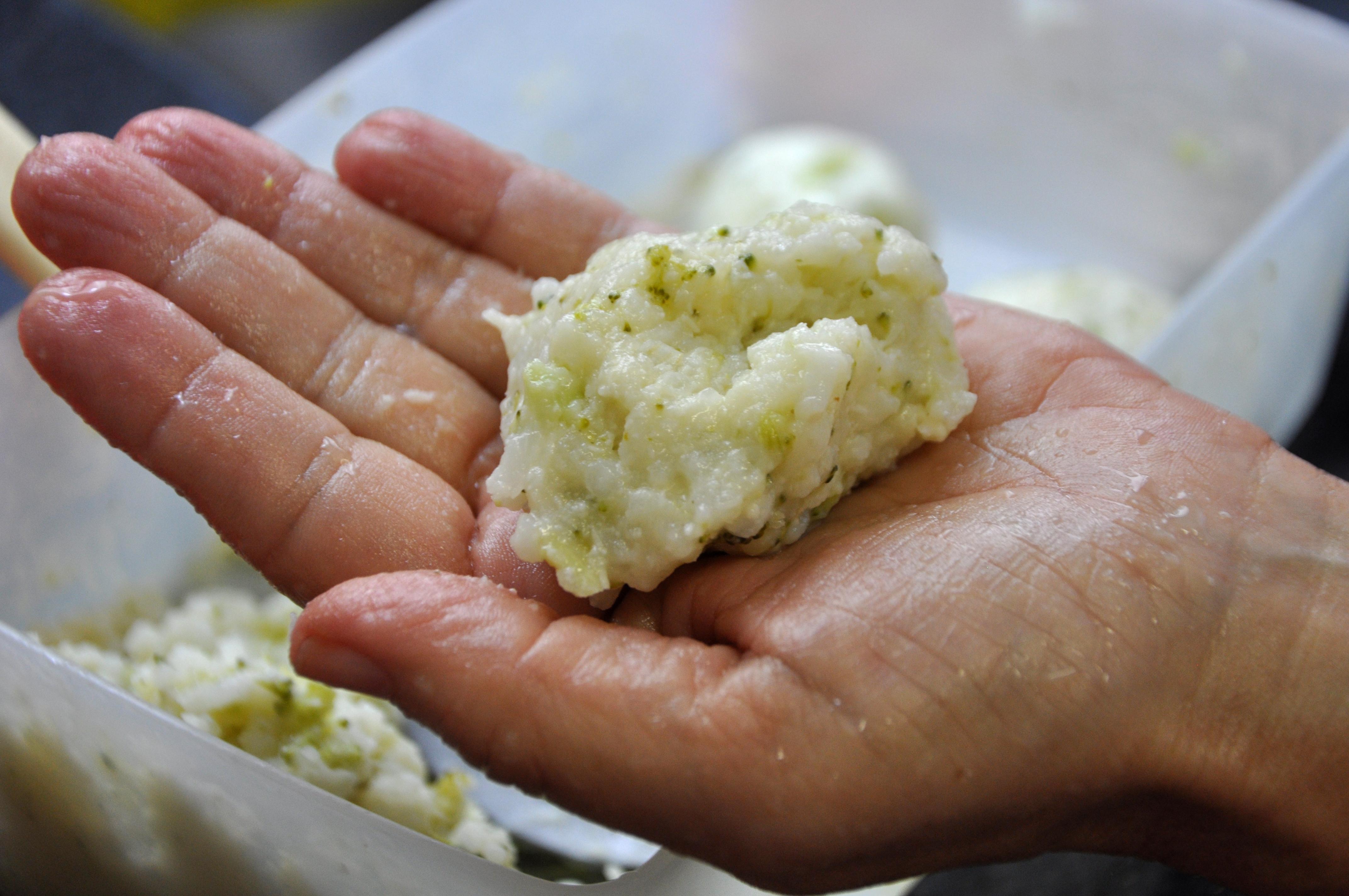 Para montar o arancini italiano, coloque um pouco de risoto na palma da mão. Recheie com a carne moída do passo anterior e junte um cubo do queijo tallegio no centro. Feche os bolinhos de risoto arancini.