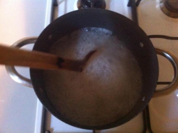 Adicione as três xícaras de água e aumente o fogo para alto. Tampe a panela parcialmente.