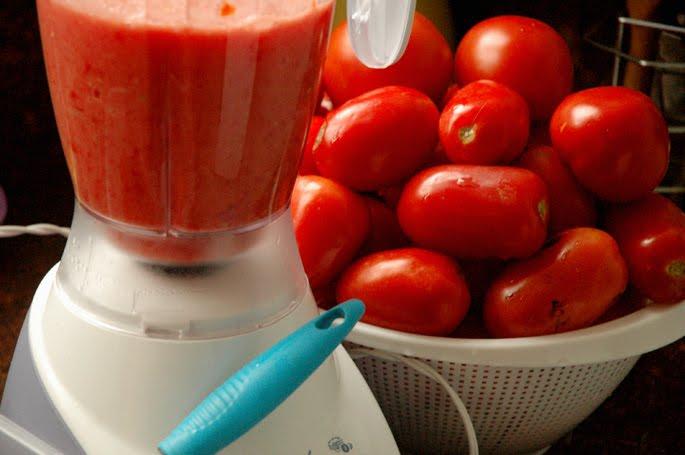 Lave e retire a pele e as sementes do tomate, corte-o aos cubos e reserve. Pique a cebola e o alho, Coloque tudo no liquidificador e triture até tornar num puré vermelhão.