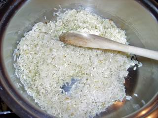 Ligue o fogo, coloque o óleo numa panela, deixe aquecer, misture o arroz e deixe ele ganhar cor, deve ir mexendo para não queimar.