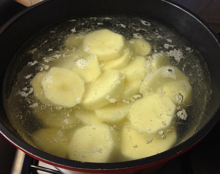Descasque as batatas, corte-as em rodelas e coloque a cozer em uma panela com água e sal. Passados 10 minutos acrescente o bacalhau em pedaços médios e deixe cozer tudo por mais 10 a 20 minutos.